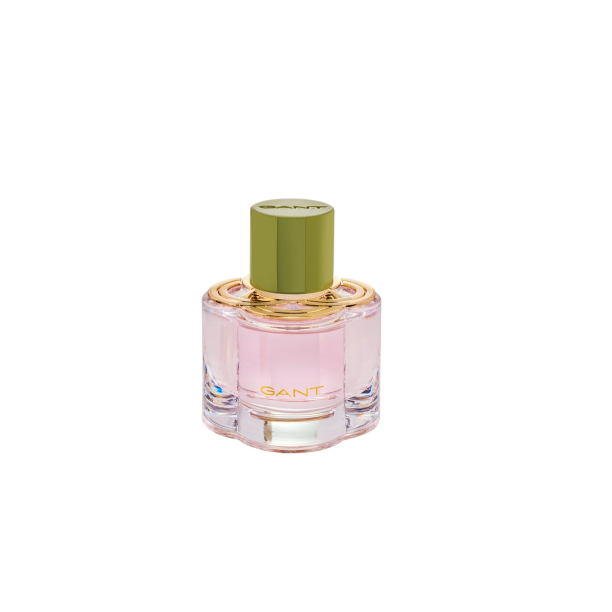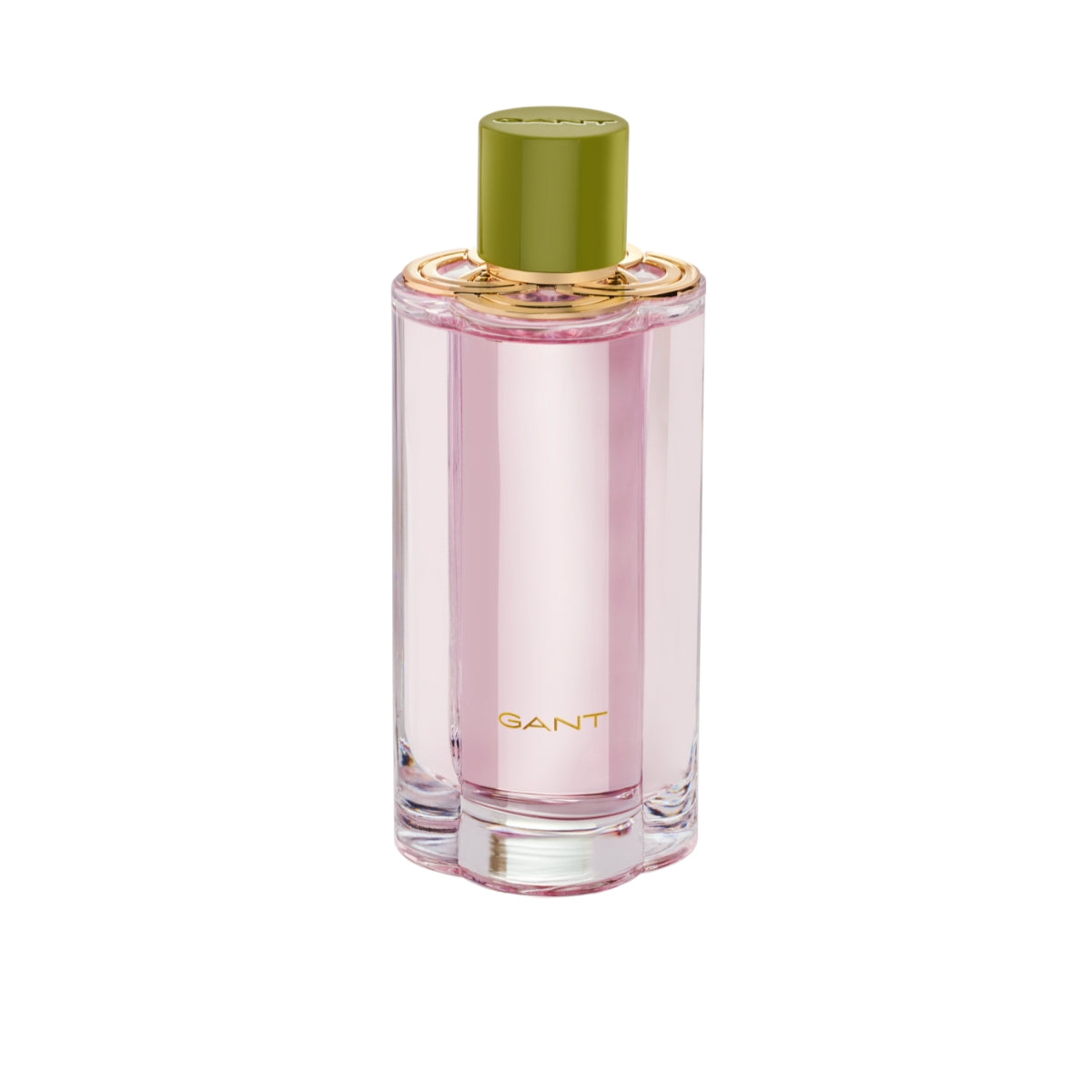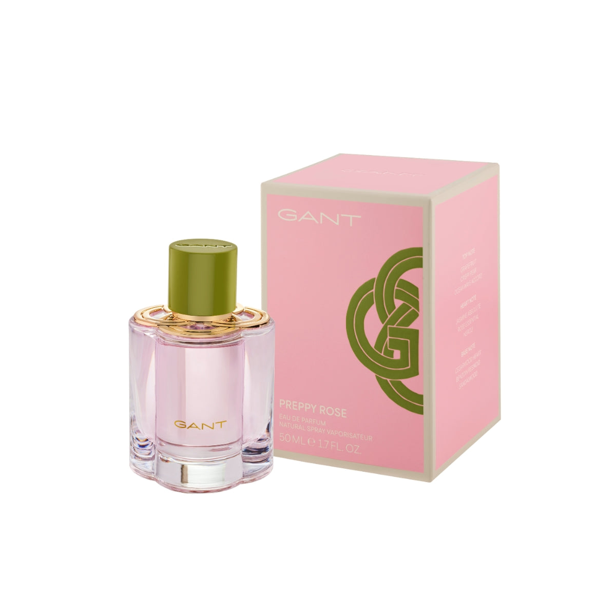 The Eau de Parfum is bottled in a sleek glass flacon, crowned with a golden plate inspired by the iconic GANT "G". The packaging features the emblematic "G" in a vivid green printed on a soft pink backdrop.